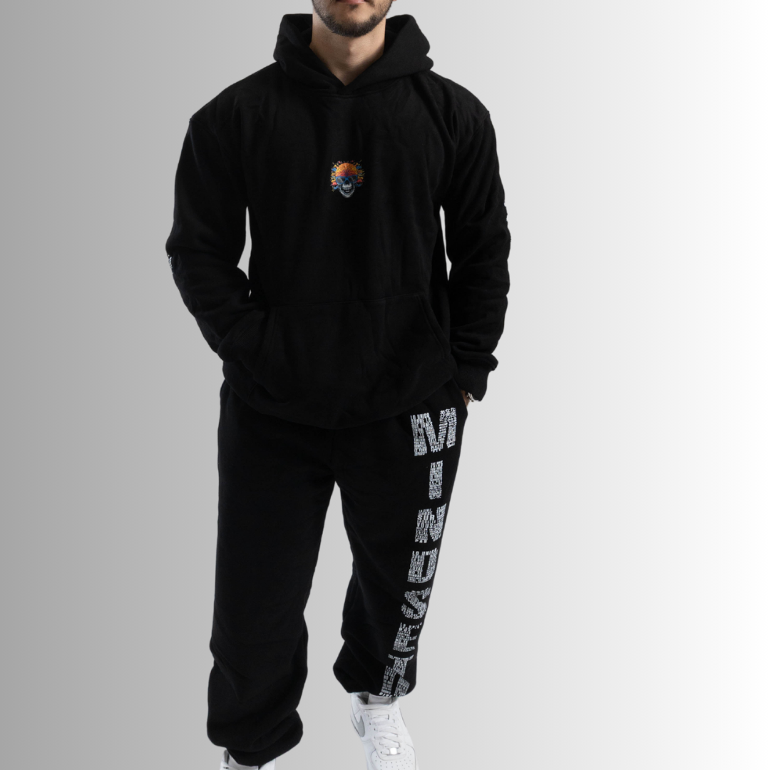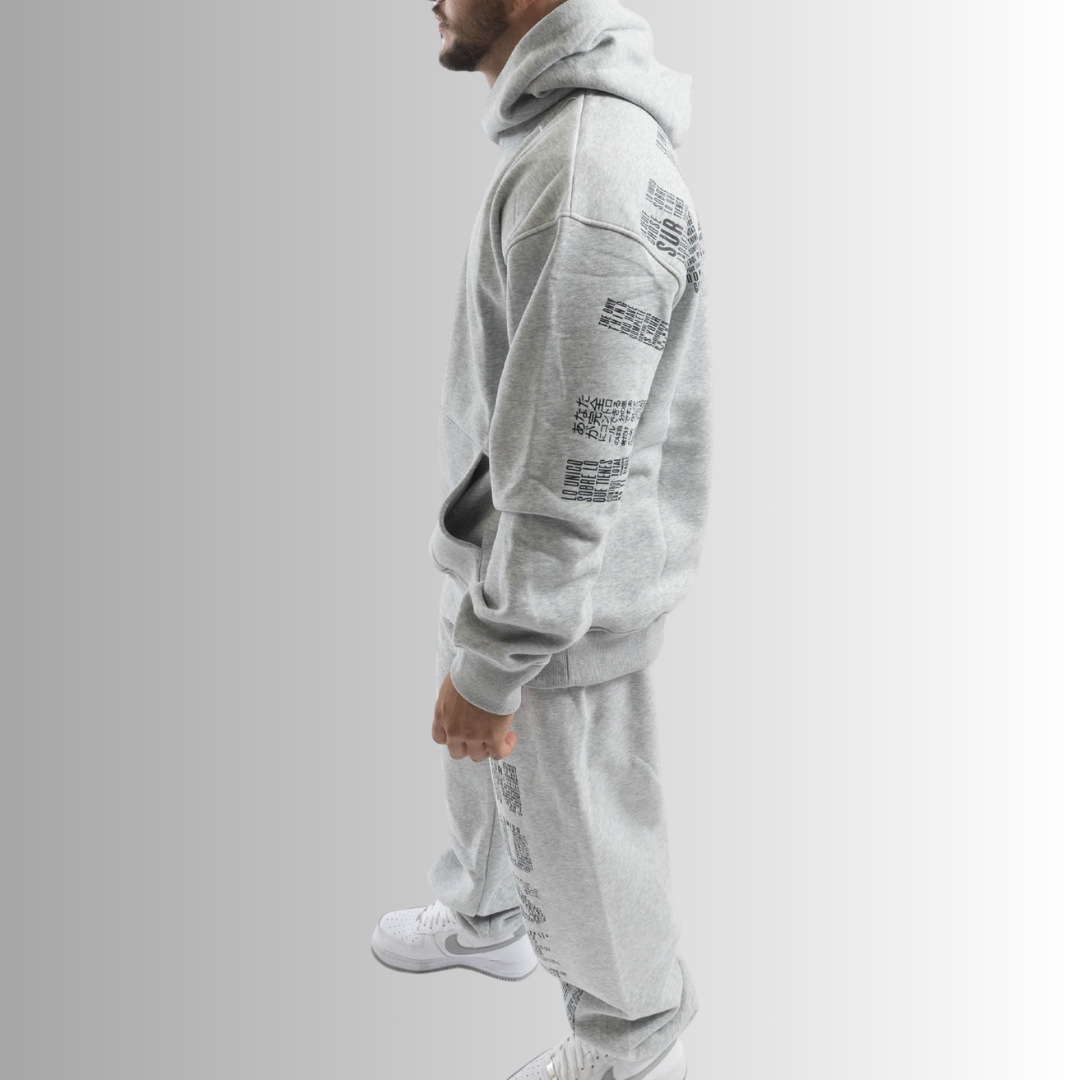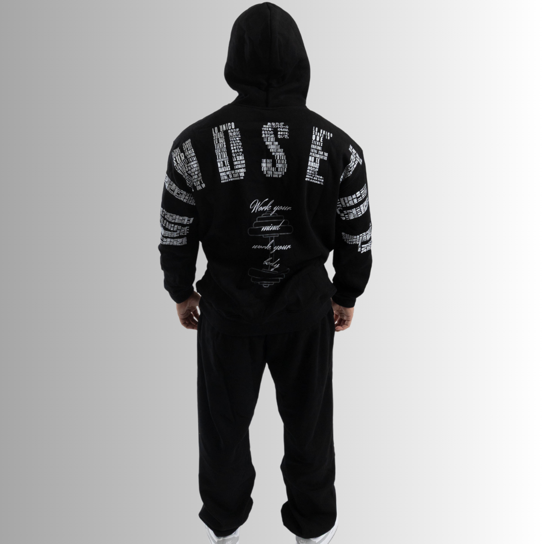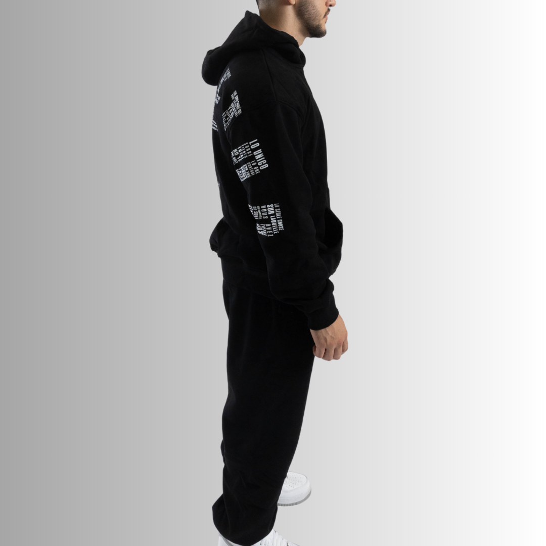 Traducido a diferentes idiomas, se arquea a través del pecho de la sudadera y fluye verticalmente por la pierna del pantalón, simbolizando dirección, presencia y poder interno.