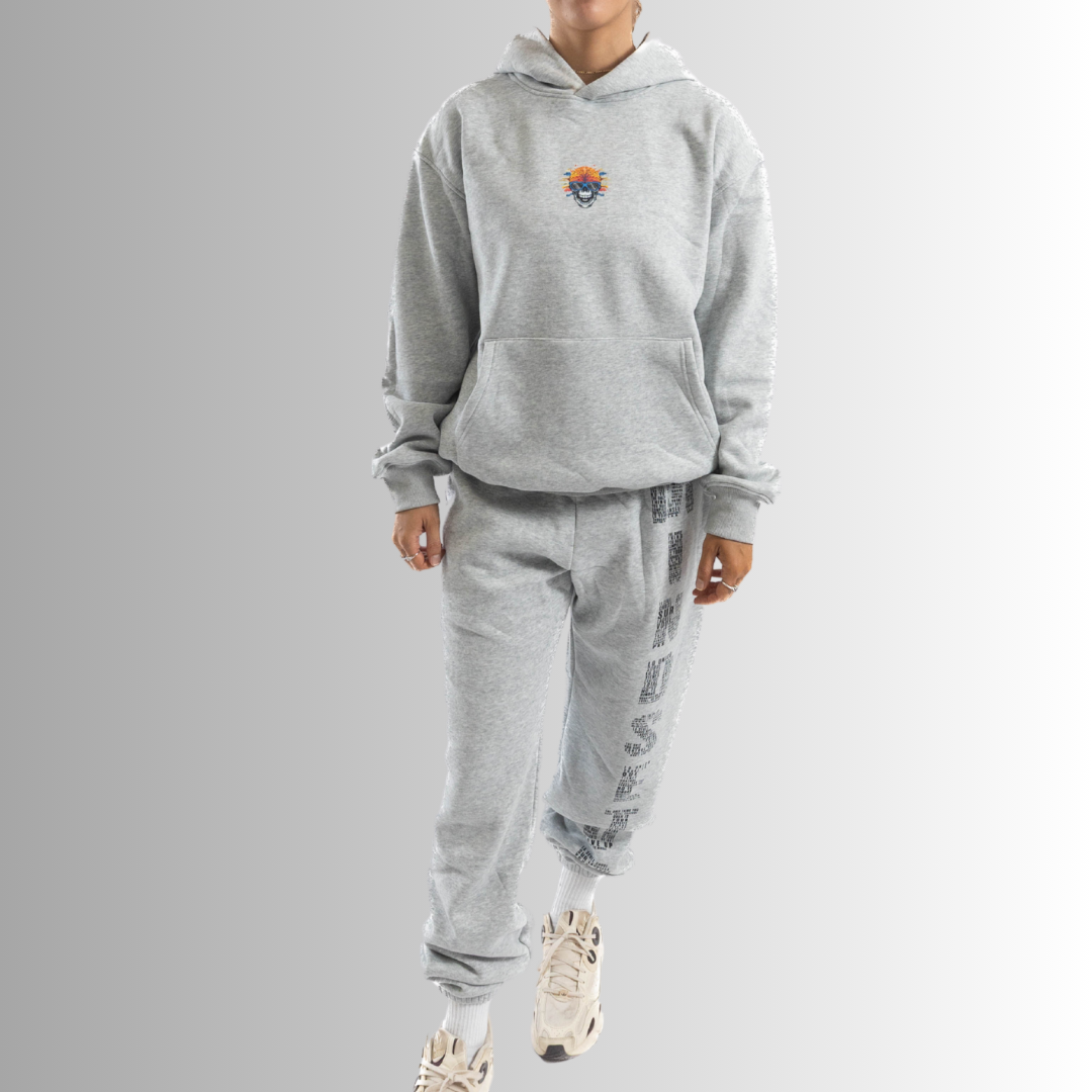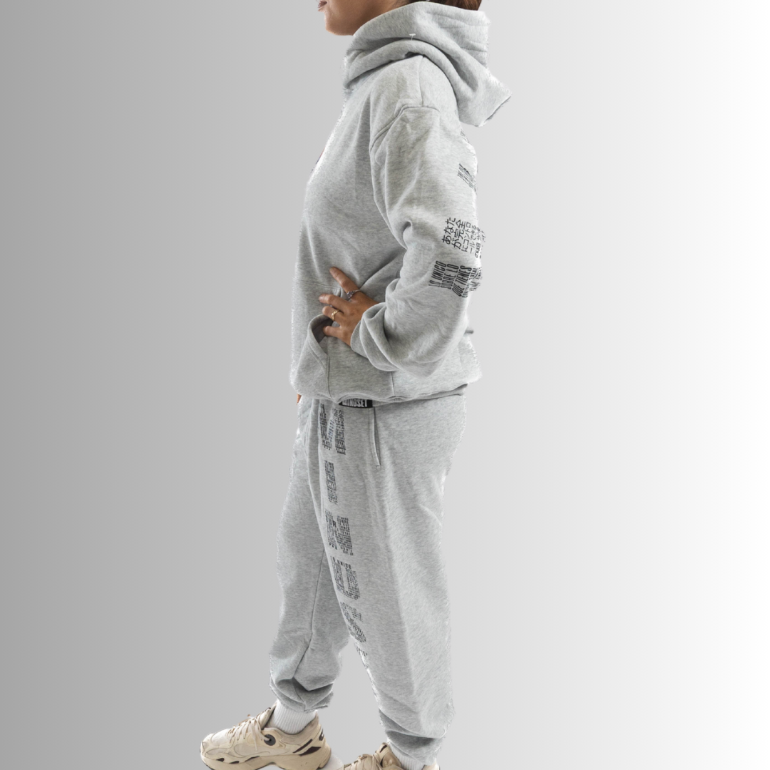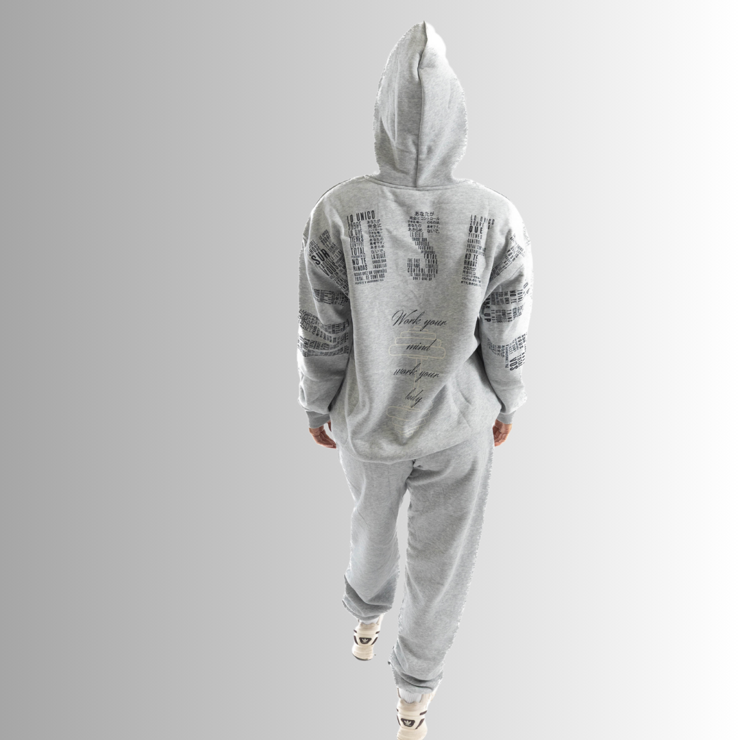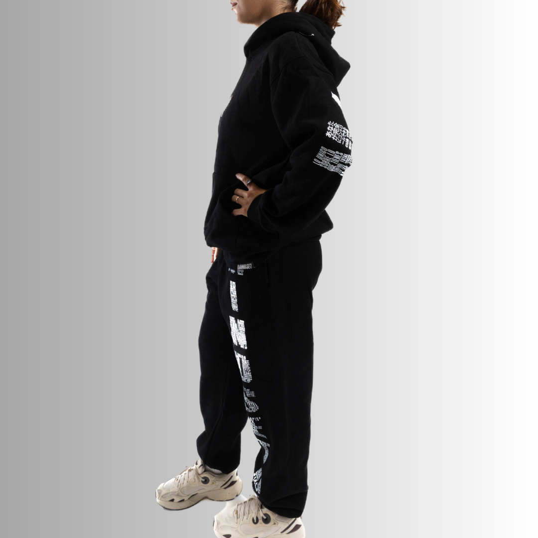 Traducido a diferentes idiomas, se arquea a través del pecho de la sudadera y fluye verticalmente por la pierna del pantalón, simbolizando dirección, presencia y poder interno.